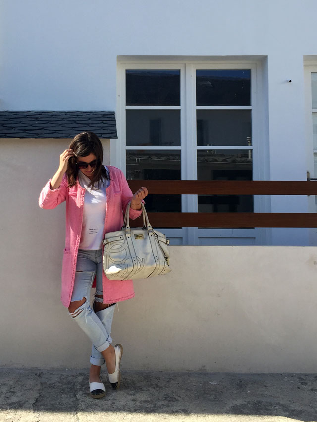¿Cómo va la vuelta a la rutina? ¿Os está costando mucho después de estos días de descanso? En casa Perlas y Coco hemos tenido un martes estupendo, y hemos disfrutado bastante del solecito que tuvimos aprovechando para bajar a la playa como habéis podido ver en las redes sociales. Y como ya sabéis cada vez que veo el sol un nuevo look primaveral aparece por aquí. No calculé muy bien el fresquito que dejaba el nordeste a la hora de vestirme, eso si al sol se estaba de maravilla. Ya sabéis que los abrigos de verano son una de mis prendas favoritas de la temporada estival, este de tweed rosa ya me acompaña desde hace algunas temporadas pero sigue siendo mi favorito sin duda, por el estilo Chanel y por ese maravilloso color rosa chicle. Esta vez decidí combinarlo con unos de mis ripped jeans favoritos (esos que cada vez que ve mi abuela quiere coser..), una camiseta básica con mensaje, y las alpargatas a las que tanto echaba de menos, una buena compra del verano pasado sin duda alguna (además este año se siguen llevando y mucho, así que ya sabéis). Y para completar el look un maxi bolso y una pulsera dorada finita con la palabra Love.