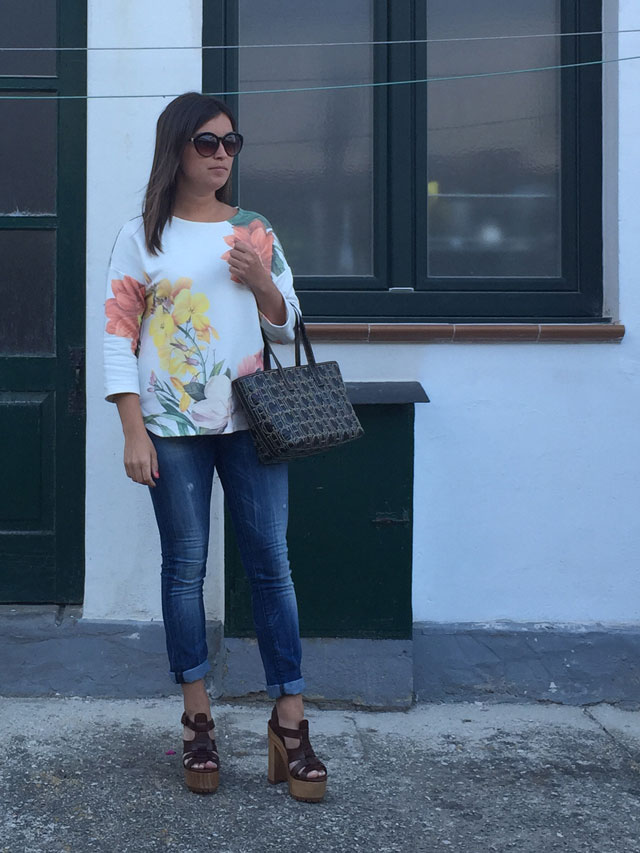 Y de nuevo volvemos al tiempo inestable, de repente sol, de repente lluvia y no sabes ni que ponerte porque a la media hora puede cambiar totalmente. Y eso me pasó el domingo estrené mi falda nueva y salí como siempre que hace sol de lo más veraniega, y como era previsible tuve que subir a casa a cambiarme y buscar un look primaveral un poco más abrigado. Como ya era tarde y solo íbamos a tomar algo y cenar fuera elegí un look bastante cómodo con mi sudadera de flores que me encanta, pero que tan poco me he puesto, unos jeans y mis nuevas sandalias a las que les preveo un gran uso de aquí a que empiece al otoño. A pesar de la altura del tacón son inmensamente cómodas y estables, y al tener bastante plataforma no tienen tanta inclinación. Para completar el look clásico bolso de Carolina Herrera en tono marrón chocolate en charol.