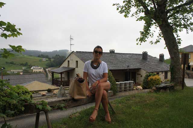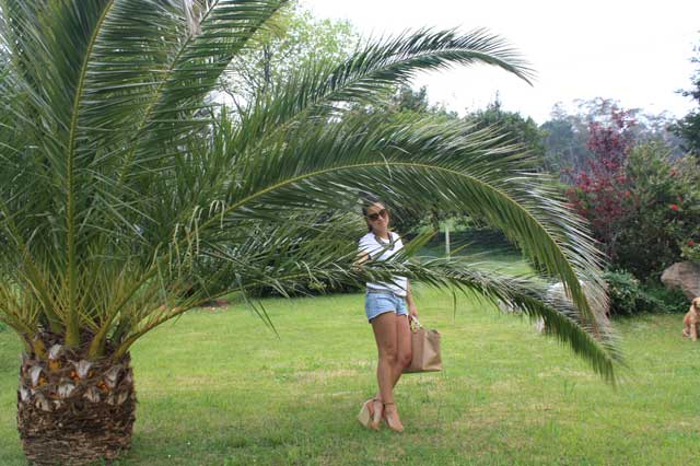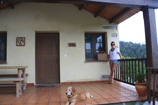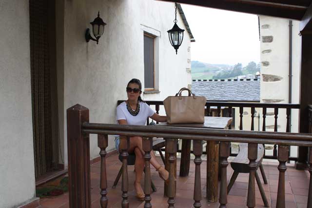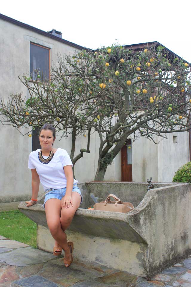 Bueno ya estamos a jueves y ya asoma el fin de semana, ¿verdad que la semana no ha sido para tanto?, a mi la verdad se me ha echo bastante amena. Ayer al medio día hacía un día estupendo y decidimos ir a visitar a un amiga a su casa de turismo rural, La Pumarega, situada en Tol concejo de Castropol (Asturias) muy cerca de Tapia donde yo vivo. La verdad que el tiempo se nos torció bastante cuando llegamos pero a pesar de el cielo cubierto la temperatura era ideal y pudimos disfrutar de una tarde en tan bonito entorno. Vimos las diferentes casas y apartamentos: Casa Pumarega (Apartamentos rurales), El pajar de Pumarega y Casa Eva (Casa de aldea), en su web podéis encontrar toda la información www.apumarega.com. Para disfrutar del día en estas casas rurales elegí un look sencillo y fresco porque cuando salimos de casa lo que sobraba era calor. Unos shorts vaqueros (un básico de verano), una t-shirt básica blanca (otra gran inversión), unas cuñas color cuero, bolso beig y un collar con detalles dorados y negros.
